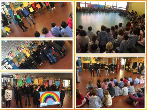 Seguiamo i ragazzi e prima di entrare nelle aule ci deliziano con una drammatizzazione della storia “la leggenda dell’ arcobaleno”: noi siamo super attenti e concentrati… loro sono nuovamente bravissimi!