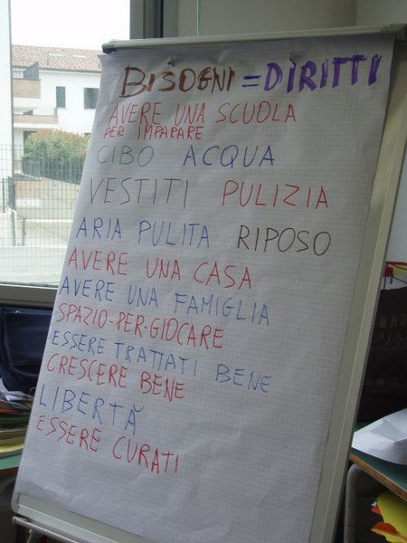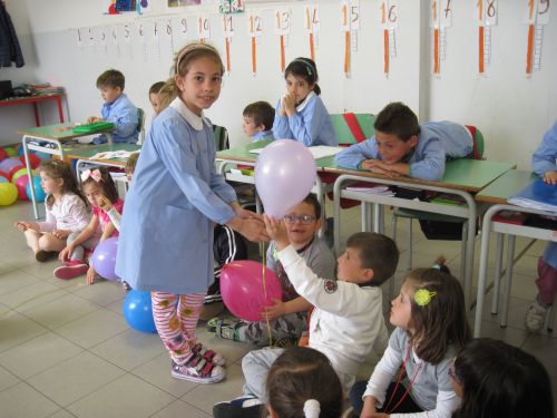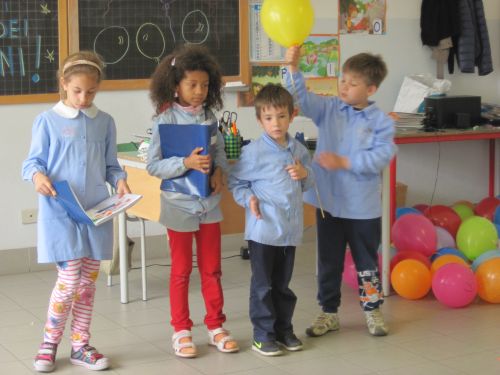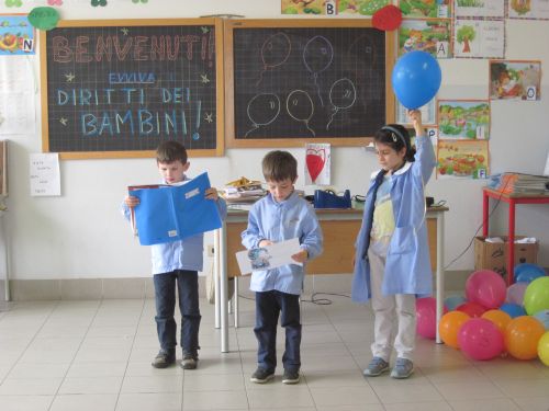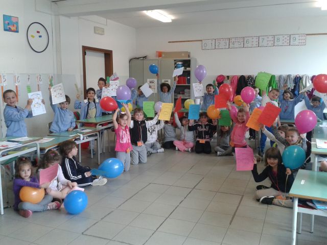 I bambini della classe prima hanno poi letto gli articoli della Convenzione Internazionale sui Diritti dei Bambini e ad ogni lettura seguiva la ricerca, nel mare di palloncini colorati presenti in classe, di quello con la dicitura del Diritto in questione.